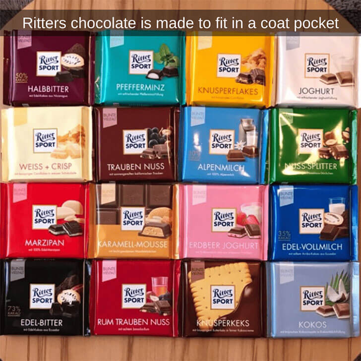 The unusual shape compactly fits the usual amount of chocolate, allowing people to carry it in their coat pockets. The manufacturers even went to court against Milka for using the square design. That’s some serious dedication for a brand!